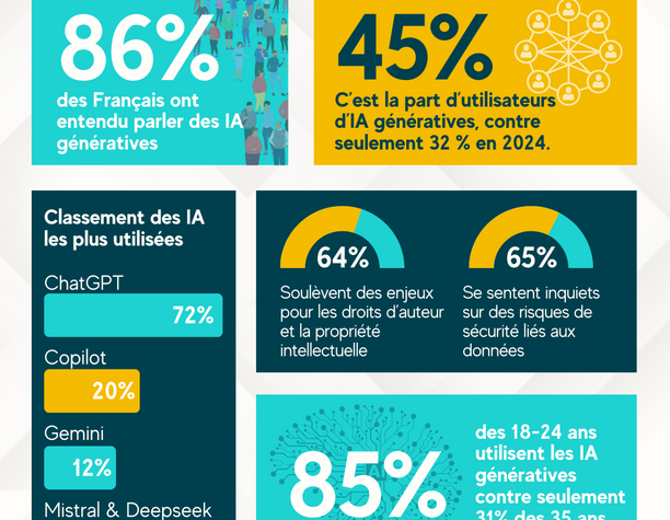 Avec 45 % d’utilisateurs en 2025, l’IA générative gagne du terrain en France. 86 % des Français en ont déjà entendu parler, et chez les 18-24 ans, l’adoption atteint un impressionnant 85 %. Plus qu’une tendance, c’est une véritable mutation des usages qui s’opère dans tous les secteurs. 📈